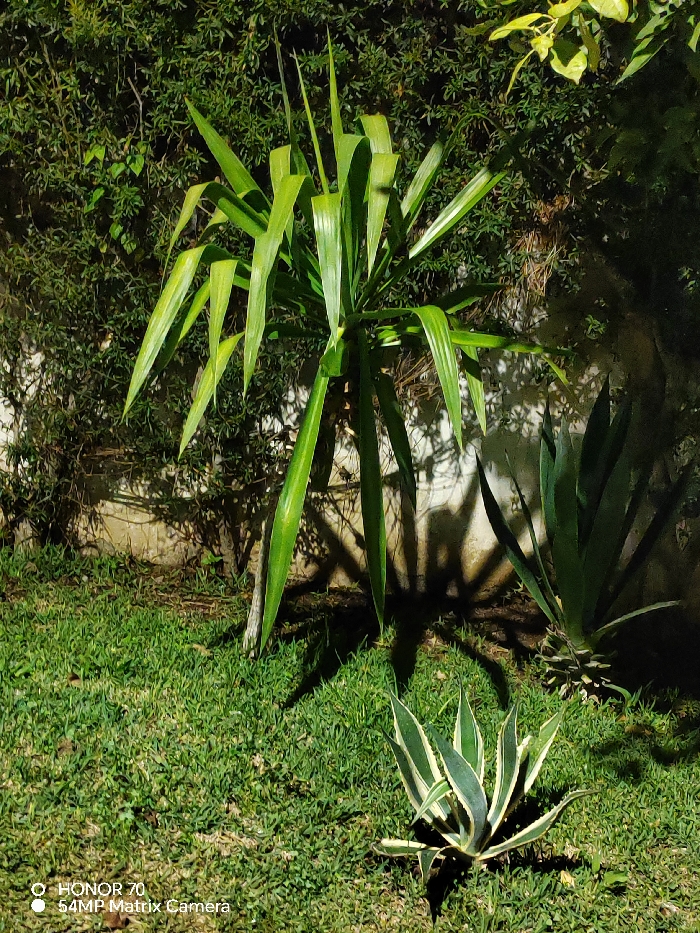 A well-lit garden scene features various plants. In the foreground, a variegated agave stands on lush green grass. Behind it, a larger agave and a tall, slender plant with pointed leaves cast strong shadows on a white wall partially obscured by dense green foliage. The lighting emphasizes the textures and contrasts within the garden.