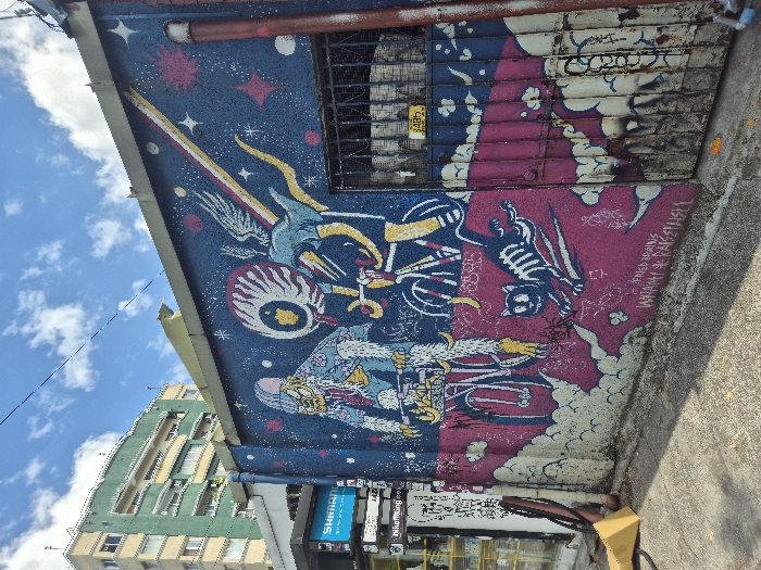 - "An outdoor scene in Makati, Philippines, captures a large, multi-colored mural on a textured building wall, bathed in sunlight under a blue sky with scattered white cumulus clouds" by FM-RLBpB3, licensed under CC BY 4.0