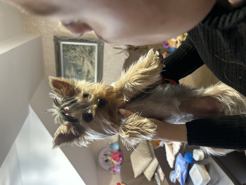 An indoor residential scene depicts a Yorkshire Terrier dog held upright by a person's hands