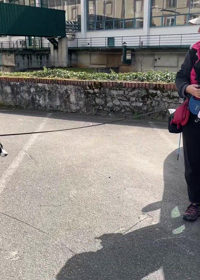 A woman dressed in a pink vest, black jacket, black pants, and a white cap is standing on asphalt near a gray Peugeot van, apparently ready to take a dog for a walk. The dog, a Border Collie with black and white fur and wearing a harness, is attached to a leash and begins to walk away from the woman, passing the van and heading towards a crosswalk. The weather appears to be sunny. A building with glass windows is visible in the background.