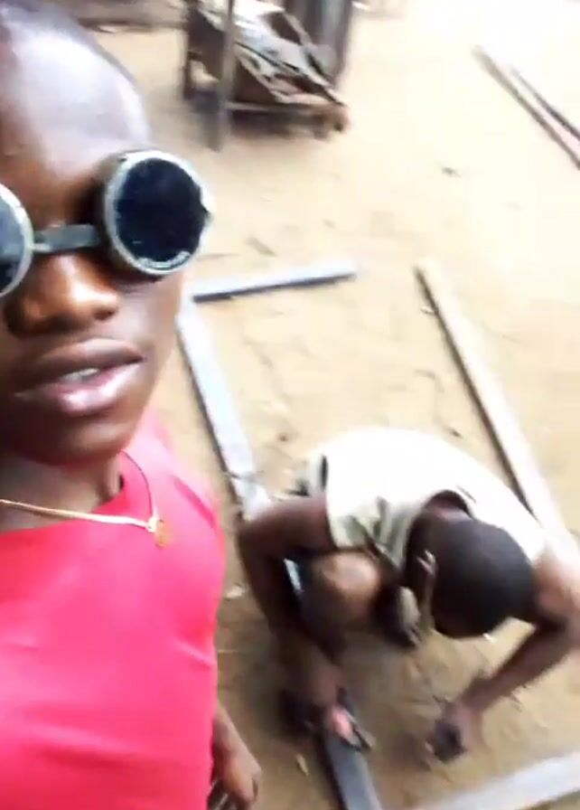 The video features a man wearing round-framed goggles and a red tank top. He's also wearing a gold chain with a pendant. He's holding the camera in front of him in selfie mode. In the background, another man is squatting down and welding metal pieces together, forming a frame. Metal rods, scraps, and tools are scattered on the ground. The ground appears to be dirt or sand. The man in the tank top gives a thumbs-up.
