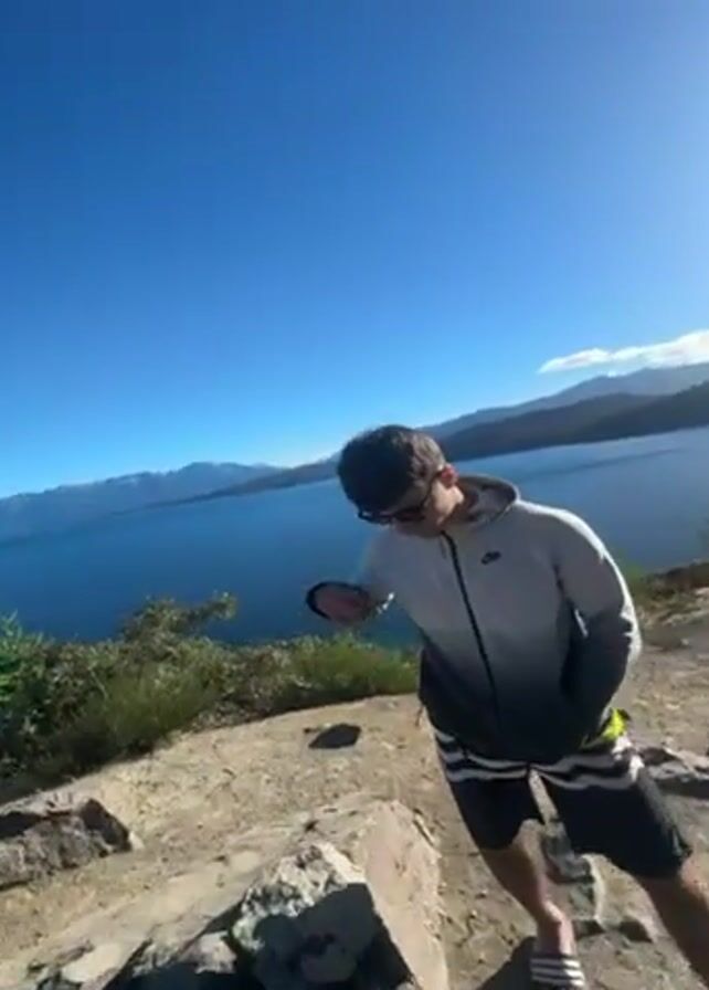 young man standing on a rocky cliff overlooking a vast body of water. He is wearing a gradient gray and black Nike hoodie, dark shorts, and sandals, and is sporting sunglasses. The camera then shifts to showcase the landscape, revealing a serene lake surrounded by tree-covered mountains under a clear blue sky. The water is calm, with gentle ripples creating a subtle texture on the surface. The environment suggests a peaceful, natural setting.