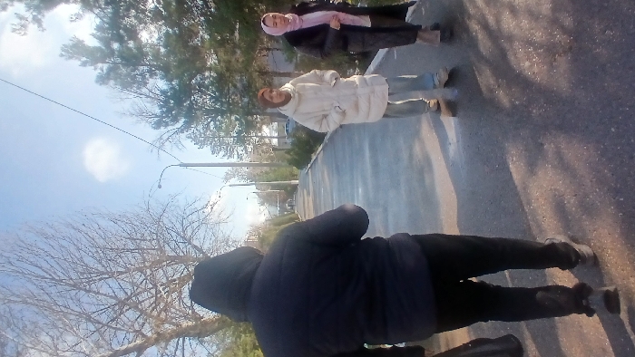Three people stroll along a paved path beside trees in daylight. One person is closest to the viewer and is wearing a dark jacket with a hood. Further away is someone in a light colored coat and pants. Farthest away is a person wearing a dark coat and pink head covering. They are on a paved path alongside greenery. Sunlight casts shadows on the path.