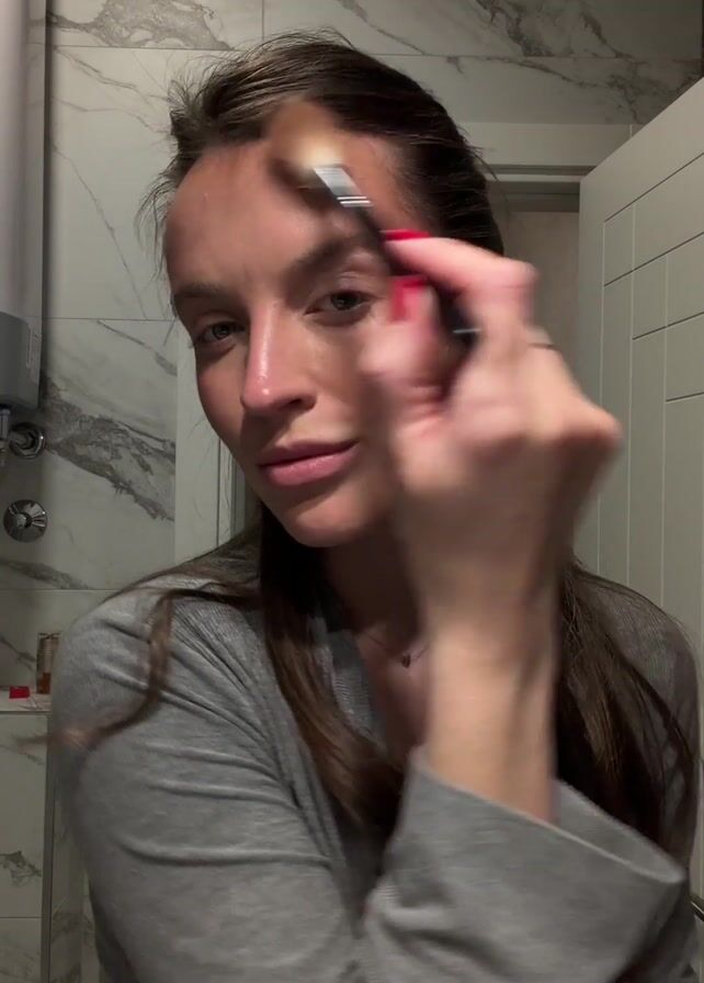 A woman in a grey pajama shirt is shown applying blush with a makeup brush in a bathroom setting
