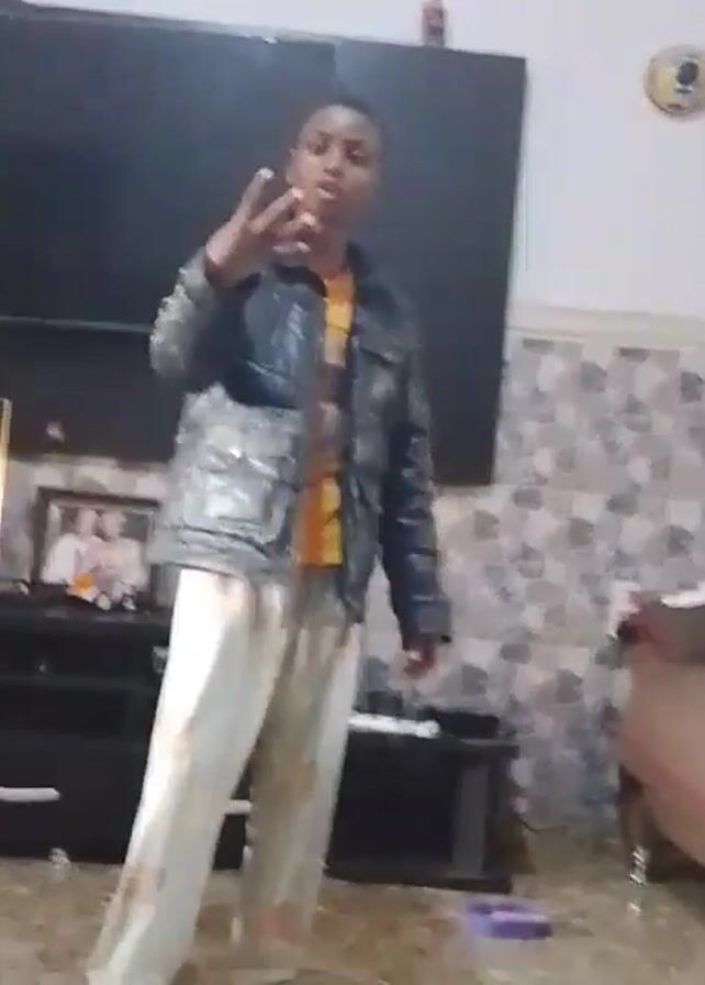 A young person, wearing a black jacket, a yellow shirt and white pants, stands in a living room. They are speaking and making hand gestures. Behind them is a large television screen and a console table. A framed picture is on the table. The room also has a sofa and tile-patterned wallpaper. There is a soccer ball decoration on the wall.