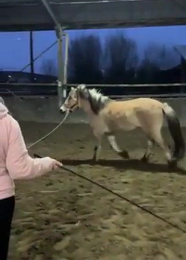 A young adult woman in a pink sweater and dark pants stands in an indoor riding ring. She holds the end of a lunge line. The other end of the line is attached to a light-colored horse that is moving in a circle. The indoor arena is under a metal roof. The light outside is dim; it appears to be dusk or early evening. Trees and a building are visible in the background.