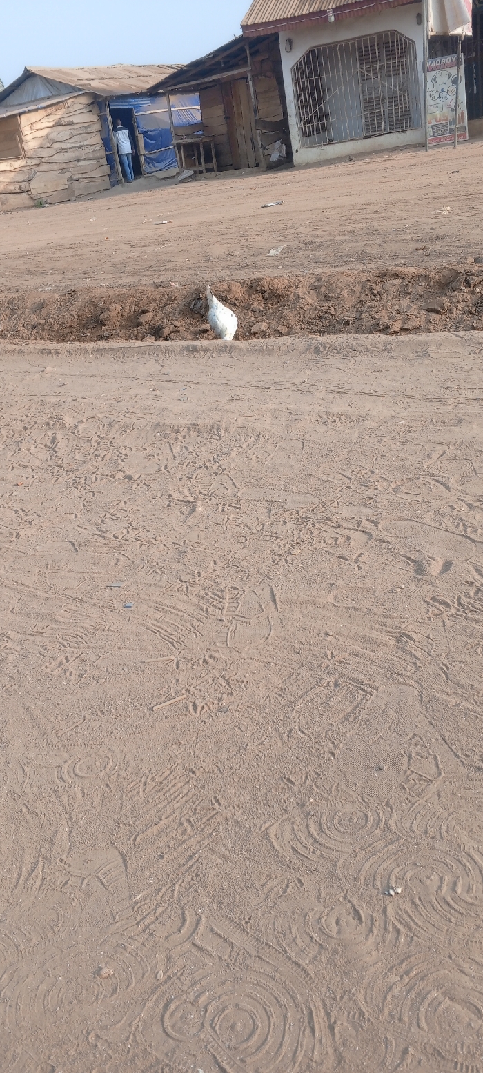 A dirt road dominates the foreground, marked by numerous tire tracks and footprints. Beyond the road, a small dirt bank leads to a group of buildings. A white chicken stands near the bank's edge. The buildings are a mix of makeshift structures with wood and corrugated metal. One building appears to be a small shop with a sign displaying images, possibly food-related. A person stands inside one of the more dilapidated structures. The scene suggests a rural or developing area.