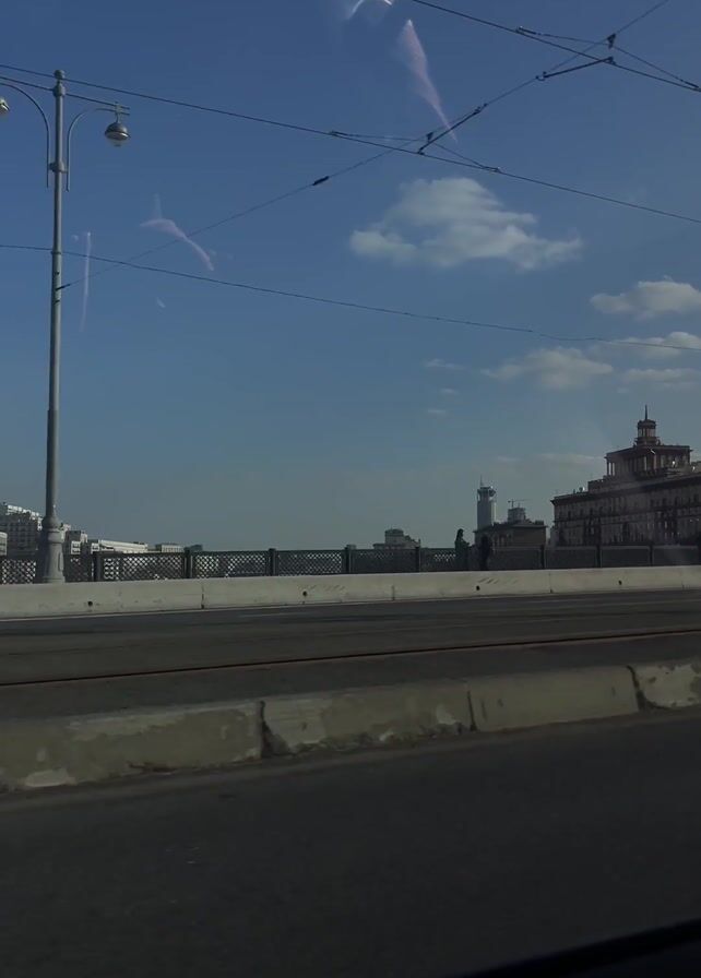 The video depicts an urban scene, likely filmed from within a moving vehicle. A bridge is in view, complete with street lights and a decorative railing. Pedestrians can be seen walking on the bridge, as well as a car and a moped. In the background are city buildings against a blue sky with scattered clouds. Power lines are also visible. The overall perspective is from low to the ground.