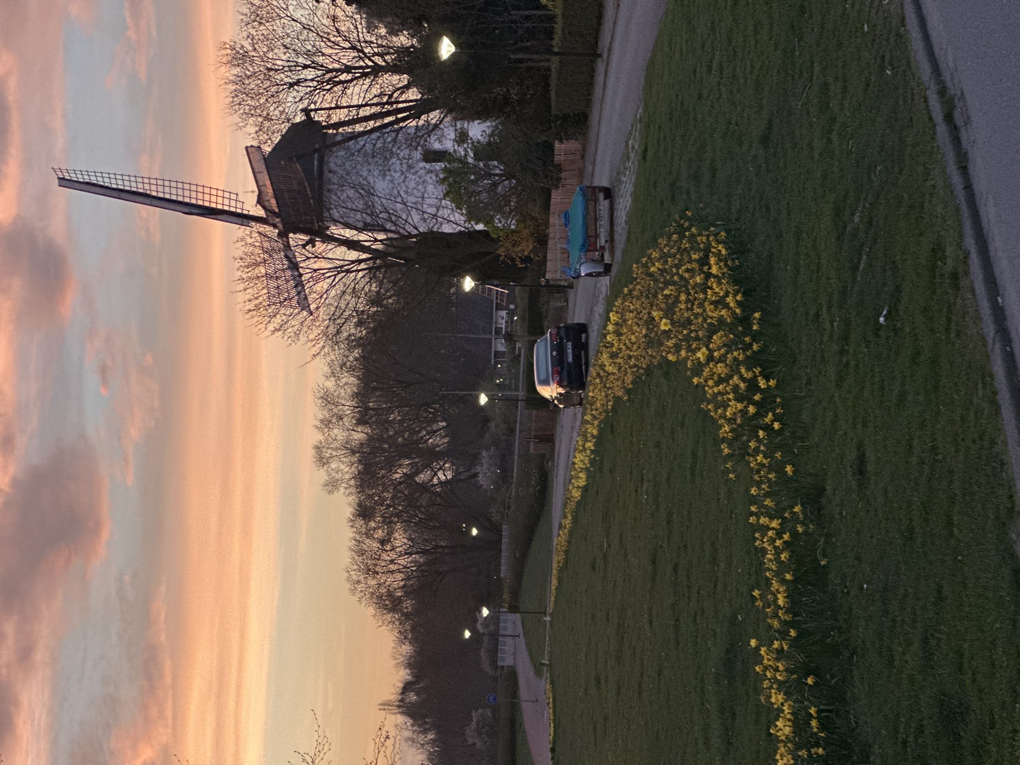 The image displays an outdoor scene at dusk, located in Geldrop, Netherlands, featuring the Molen aan de Nieuwendijk windmill. The sky occupies the upper third, showing a gradient from orange-pink at the horizon to light blue at the zenith, with scattered, dark-underside clouds. In the mid-ground, the white structure of the Molen aan de Nieuwendijk windmill stands prominently on the right side, surrounded by bare deciduous trees. Its dark sails are visible against the sky, one pointing upwards and another angled downwards to the left. A paved road curves through the center-right of the frame, bordered by a line of streetlights with illuminated white fixtures. Two vehicles are present on this road, facing away from the viewer: a dark-colored sedan (Dutch license plate P-702-WG) followed by a small, two-wheeled utility trailer covered with a teal tarp (Dutch license plate TK-487-P). A low, light brown wooden fence is visible to the right of the road, behind the vehicles. To the left of the road, a wide expanse of manicured green grass dominates the foreground. A distinct, crescent-shaped border of vibrant yellow daffodils (Narcissus) is planted along the edge of the grass, following the curve of the adjacent paved path or road. Further to the left, a paved pathway or bicycle lane (marked by a blue bicycle sign) recedes into the distance, lined by more streetlights and trees. No individuals are visible in the scene.