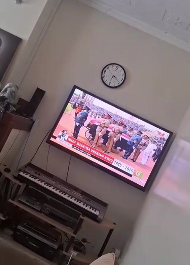 room where a TV is playing news coverage of a ceremony. On the TV screen, people are wearing white hats and colorful robes. Text on the screen says "IBADA YAFANYIKA UWANJANI NYAYO 1945 - 2023." Below the TV, there's a keyboard and other electronic equipment on a shelf. A wall clock is above the TV and shows about 12:32. The room's walls are painted a light color, and the ceiling has a textured pattern. A glimpse of a cushion and other parts of the room's furniture can be seen. There is a somber song playing in the background.