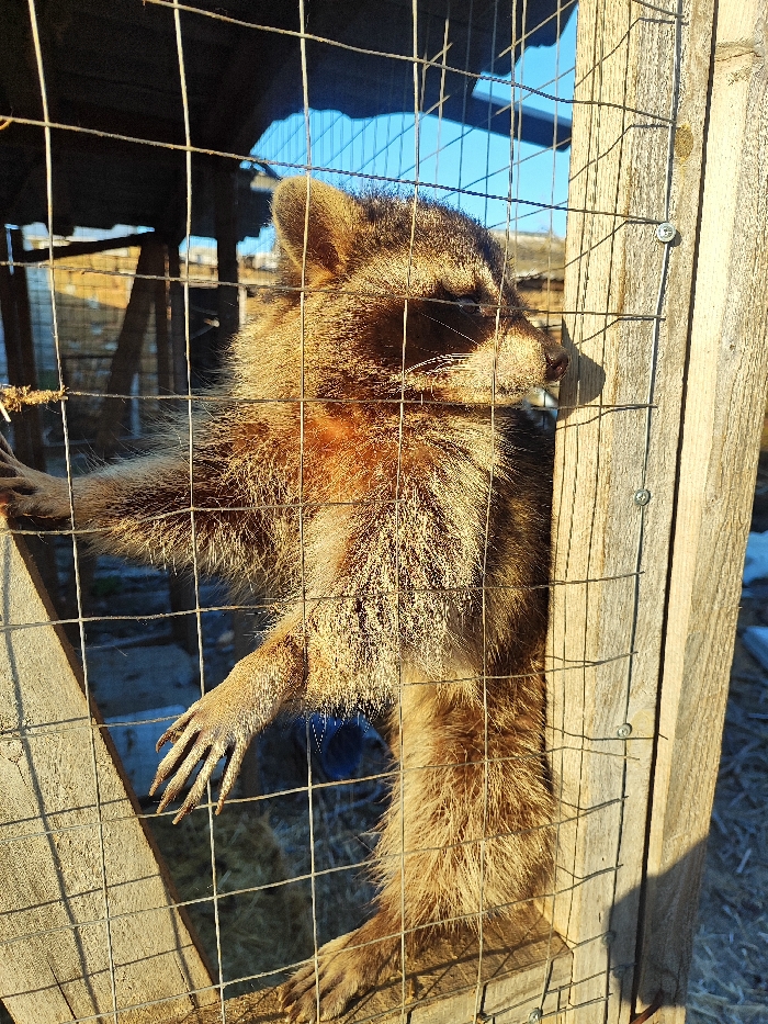 - "An adult raccoon stands upright on its hind legs, holding onto a galvanized wire mesh fence with its front paws, within an outdoor enclosure in Балаклавский округ, Ukraine" by FM-pJyc73, licensed under CC BY 4.0