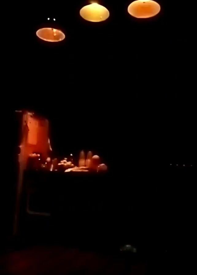 dark room with three pendant lights hanging from the ceiling. Beneath the lights, there is a table displaying various items, possibly food or decorative objects. The overall scene is dimly lit, with only the lights and the objects on the table visible. The table appears to be near a wall. In the background, there are some distant lights.
