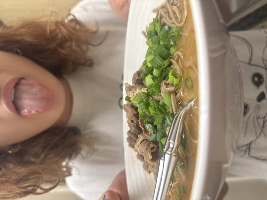 A young woman with curly hair sticks her tongue out to the left of a bowl of soba noodle soup