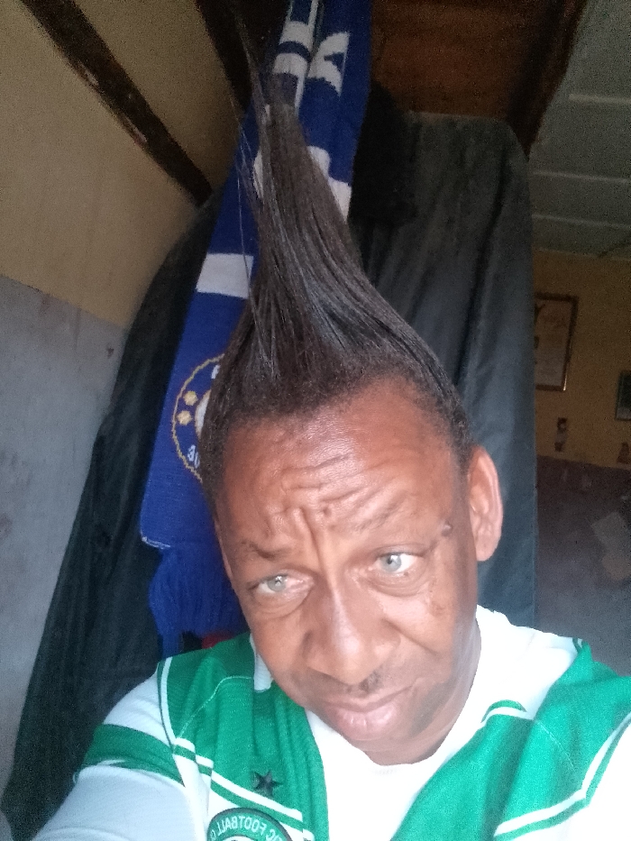 A man with striking gray eyes and a neatly trimmed mustache stares into the camera. He sports a green and white soccer jersey. His dark hair is styled into a tall, spiky mohawk. In the background, a blue and white scarf hangs beside a dark-colored jacket. A glimpse of a framed picture on a yellow wall can be seen in the distance. The overall image is a close-up shot, emphasizing the man's unique style and expression.