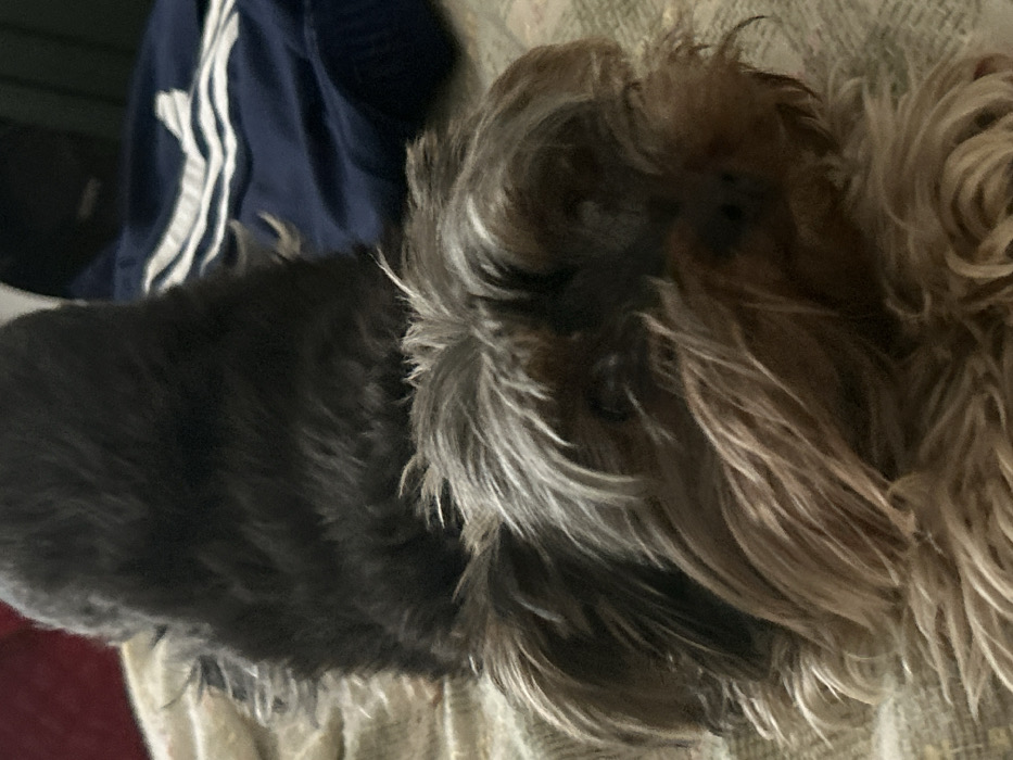 - "The scene, located in Resilovo, Bulgaria, depicts a small domestic canine, consistent with a Yorkshire Terrier or similar terrier breed, resting on a light-colored, textured fabric surface" by FM-W8Enk1, licensed under CC BY 4.0