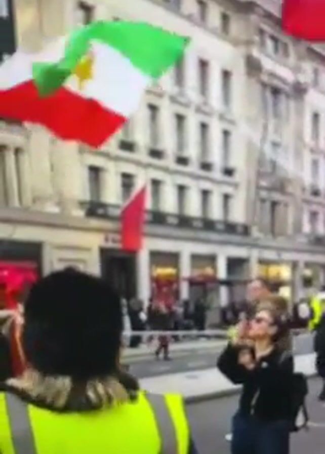 daytime street scene with a small crowd of people, some wearing bright yellow safety vests, near a street intersection. A woman standing near the center of the frame is operating a kite, causing two Iranian flags to fly in the air. The architecture surrounding the event consists of tall, light-colored buildings with multiple windows. The camera is positioned from behind a person wearing a yellow vest. The scene seems to be part of a demonstration or gathering, with the flags being a central symbol.