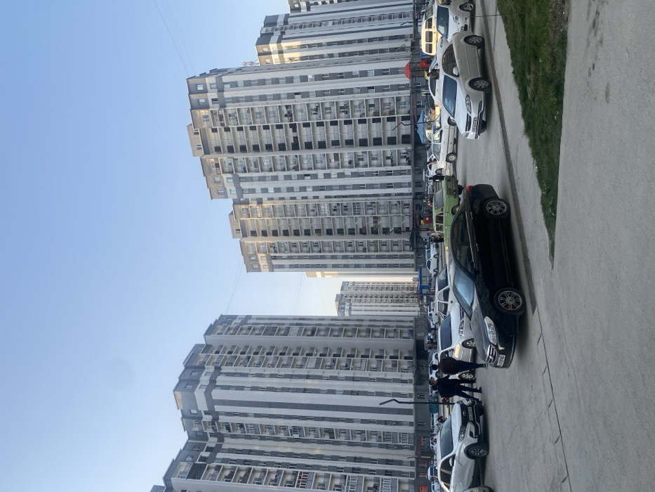 This image depicts an urban residential scene in Samarkand City, Uzbekistan, under a clear, light blue sky