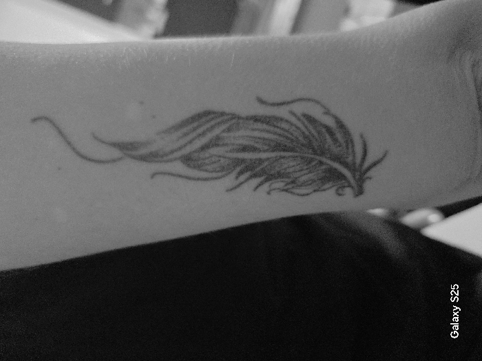 The scene depicts a close-up, black and white photographic rendering of a human forearm, likely indoors in Karnalovo, Bulgaria. The arm, oriented vertically, displays a single tattoo on its lateral aspect. The tattoo depicts a stylized feather or flame-like motif, approximately 7-8 cm in length, executed in black ink with intricate line work suggesting feather barbs and flowing contours. The skin around the tattoo appears clear. To the left of the arm, a dark, out-of-focus fabric element is visible, consistent with a sleeve or garment. The background is indistinct and blurred, showing muted tones of light and shadow. The text "Galaxy S25" is present in the lower left corner of the image. No individuals are fully visible, only the segment of the arm.