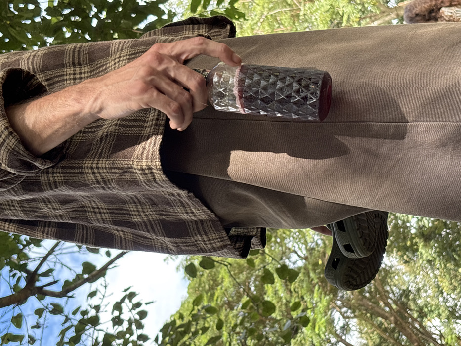 A person holds a decorative bottle filled with red liquid outdoors. They wear brown pants and a plaid shirt. Green foliage and trees are visible in the background. The person also wears a green clog. The image is taken from a slightly low angle.