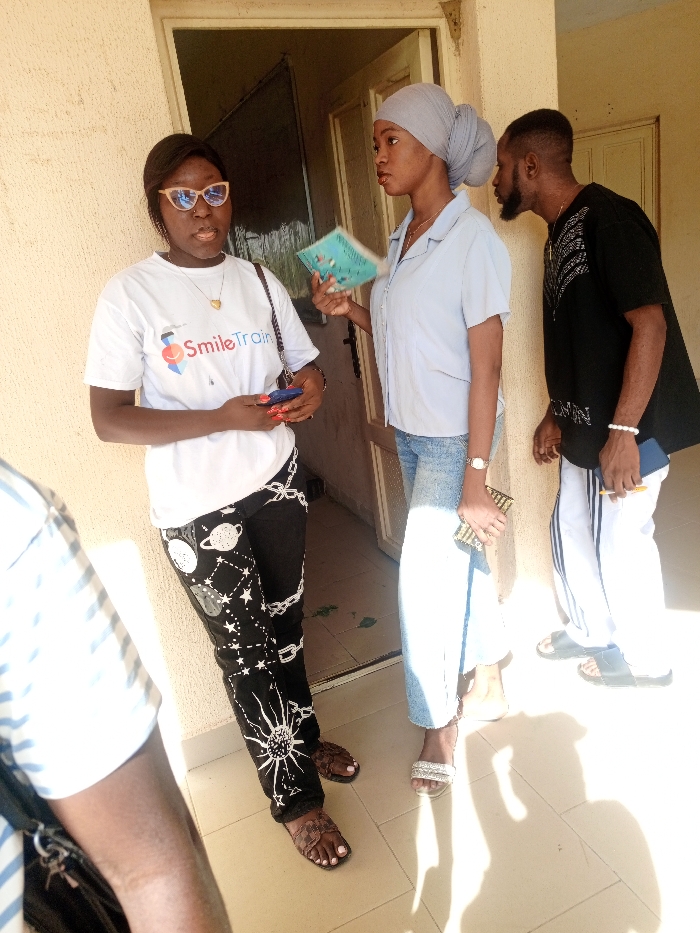 This image depicts a scene located in Dabawa, Nigeria, featuring four individuals in an indoor/outdoor transition area with a light-colored tiled floor and a beige wall