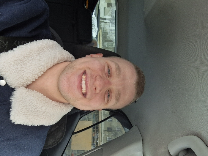 A male individual is positioned in the driver's or front passenger seat of a vehicle, taking a selfie. He has light skin, short light-brown hair, and is looking directly at the camera with a broad smile, exposing his upper and lower teeth. He is wearing a dark blue jacket featuring a prominent cream-colored, fluffy collar, secured by a single white button visible at the bottom of the frame. A dark seatbelt strap crosses his chest from his left shoulder. The vehicle's interior features a grey fabric headliner and a grey overhead grab handle on the right side. Through the vehicle's rear and side windows, a blurred urban environment is visible, indicating the city of Makiivka, Ukraine, during daylight hours. Structures consistent with multi-story buildings and indistinct foliage are discernible in the background. A dark-colored headrest is visible behind the subject.