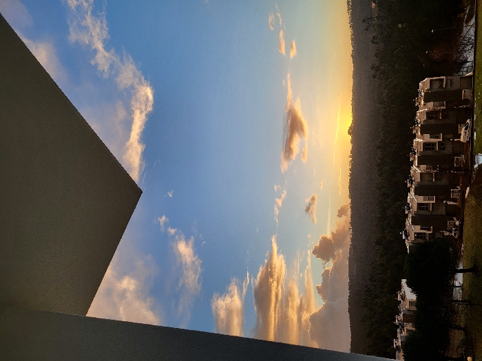 A sunset scene with a blue sky and golden clouds