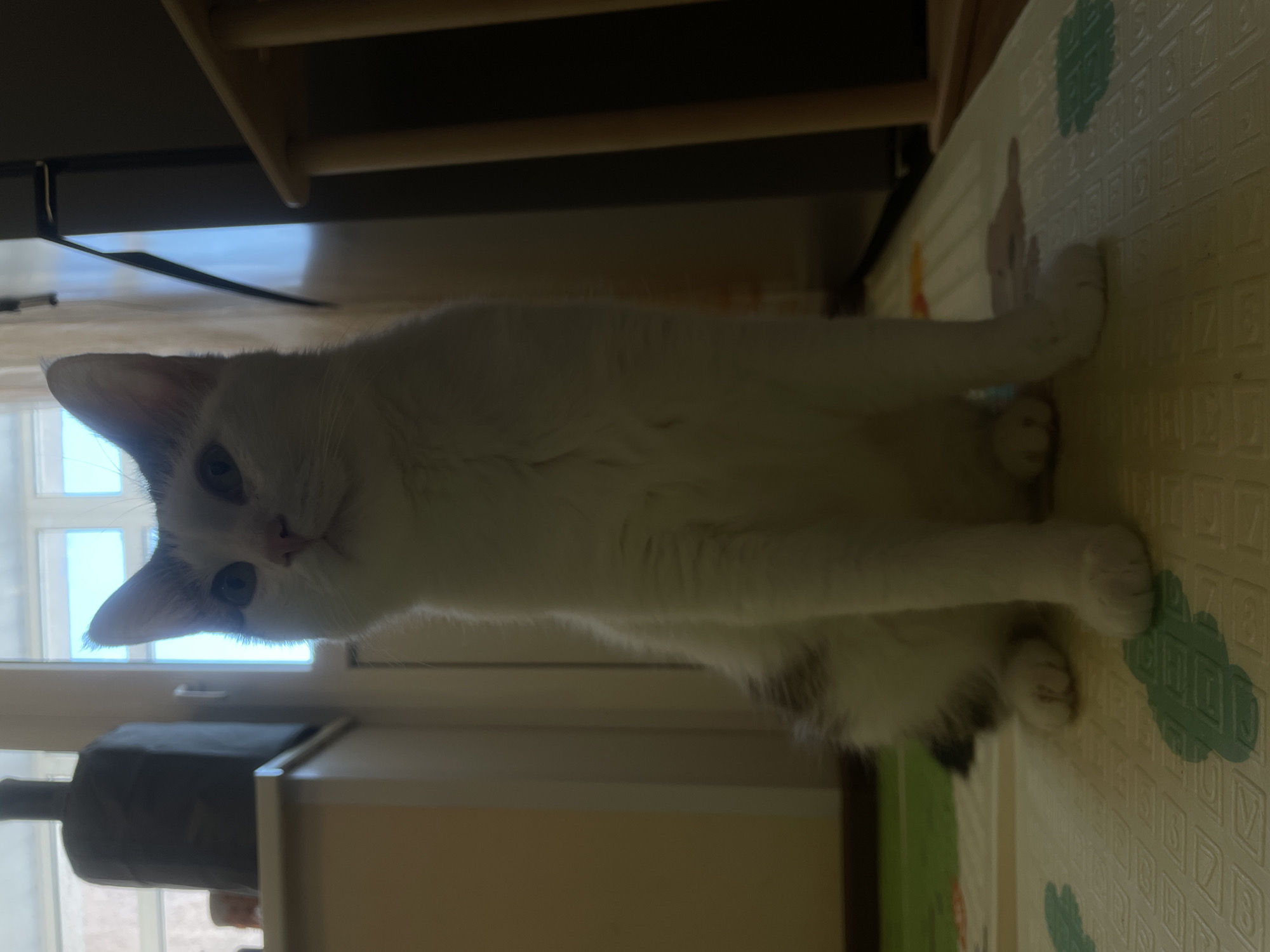 The image captures a domestic cat seated upright in an indoor setting, presumed to be in Tolyatti, Russia. The cat, primarily white with grey markings on its head and ears, and subtle darker patches on its lower back, faces upwards and slightly to the left. Its eyes are open, directed towards the upper left. The animal rests on a light-colored foam playmat embossed with grid patterns and featuring a green, irregular shape in the immediate foreground. In the background to the left, a light-colored counter or cabinet is visible, upon which a dark, irregularly shaped object, possibly an appliance, stands silhouetted against a brightly illuminated window. A faint reddish object is partially visible behind the dark object. To the right of the cat, a dark, vertical appliance, likely a refrigerator, is present. Further to the right, a light-colored wooden structure consisting of vertical posts is partially visible. The scene is illuminated by natural light from the window, creating a somewhat underexposed effect on the foreground.