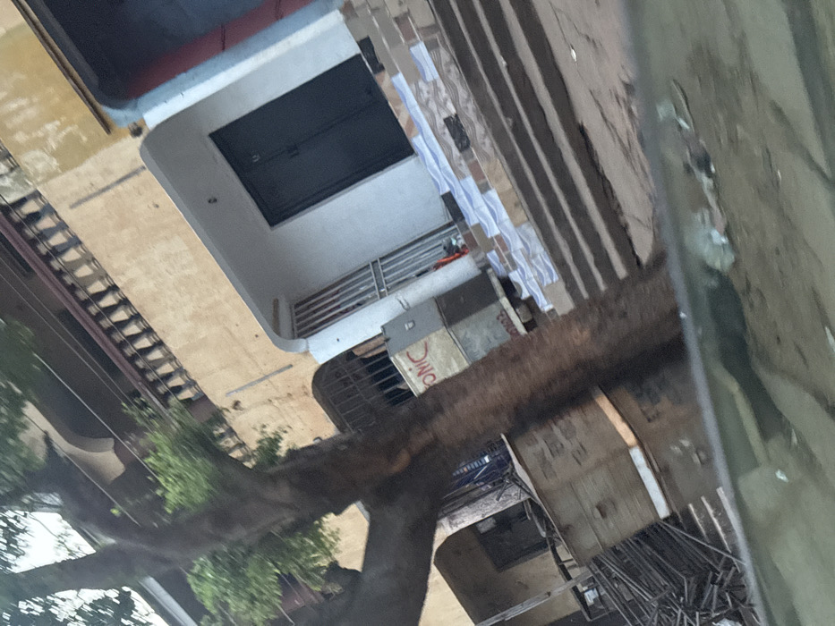An overhead, slightly tilted shot reveals a building complex with varied architectural features. A building with a dark-colored door and a metallic railing juts out, shadowed. Next to it, a structure displays what seems to be a patterned exterior and laundry lines. Foregrounded is a blurred tree branch, obscuring part of a lower building adorned with a signage. Concrete structures and rebar piles are visible at the bottom, implying ongoing construction or materials storage.
