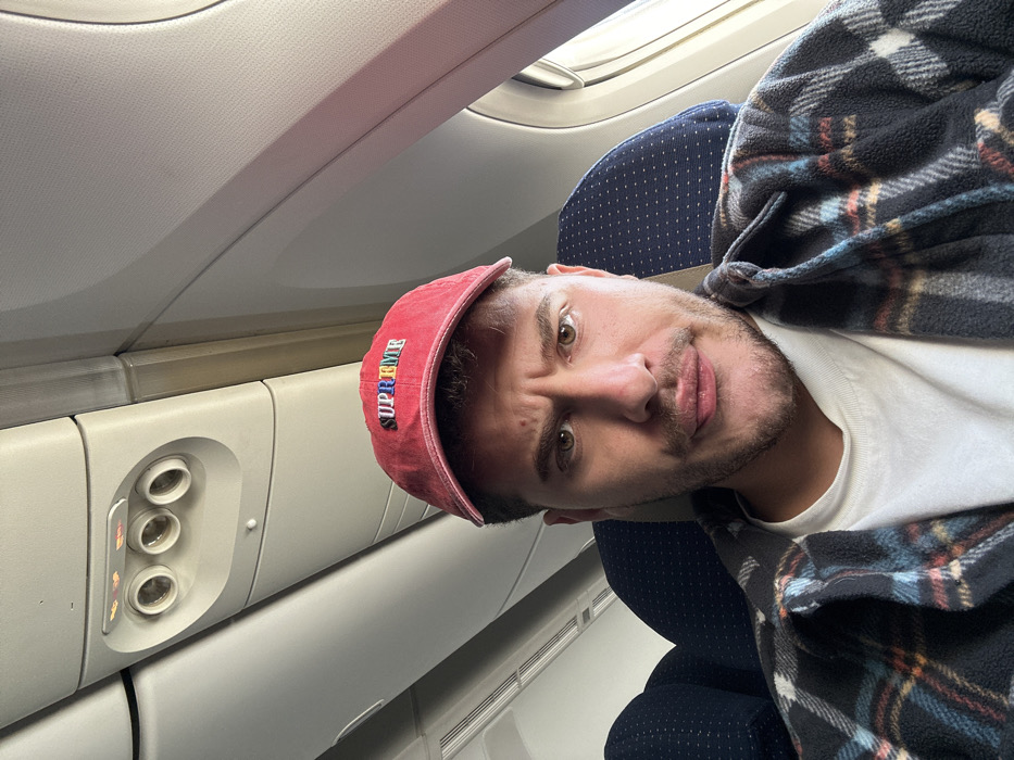 The image displays a close-up selfie of a male individual situated within the cabin of a commercial airplane