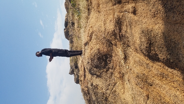 A single adult male stands on a prominent rocky outcrop under a bright blue sky with scattered white clouds. The landscape is characterized by large, textured, light brown to reddish-brown rock formations, consistent with the geology of the Jos Plateau in Jos, Nigeria. The man, appearing to be of African descent with a short beard, is dressed in dark, possibly black, long-sleeved attire and trousers, with visible white soles on his footwear. He is holding a small, light-colored object, possibly a mobile phone, with both hands at chest level, appearing to interact with it. Sparse, dry, light-colored vegetation grows among the rocks. The scene is illuminated by natural daylight, suggesting midday conditions on an elevated, rugged terrain.