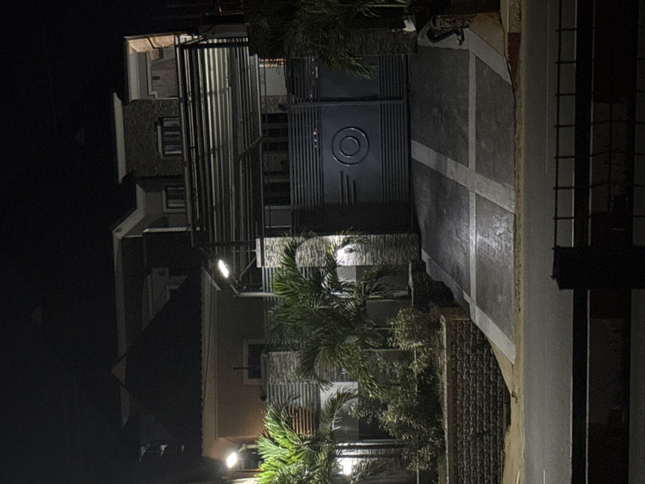 A nighttime view of a modern building with a gate, flanked by palm trees. The gate features a circular design. The building has multiple levels, stone accents, and a sloped roof. Street lights illuminate the scene. The driveway is paved with a contrasting pattern. A fence runs along the edge of the driveway.