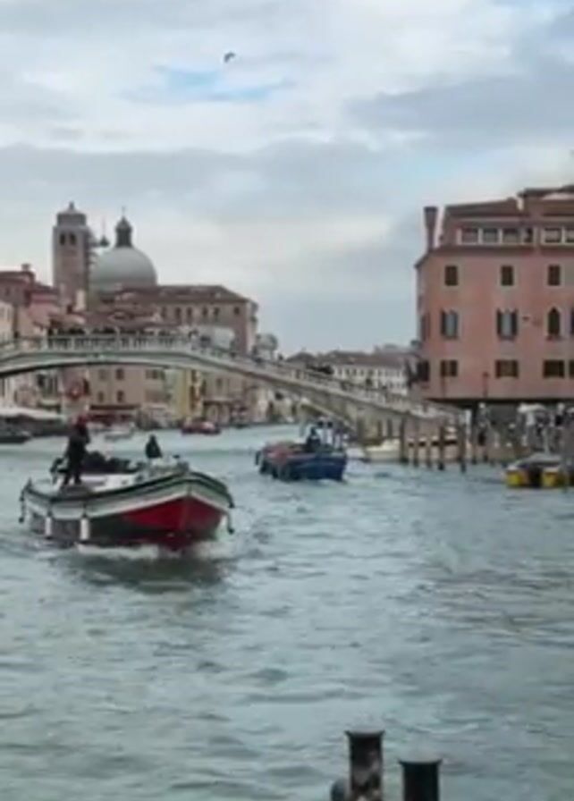 The video depicts a canal in Venice, Italy, with a red and white boat moving in the foreground. There are a few people on the boat. Another blue boat is following behind. A bridge with people walking across it arches over the canal in the mid-ground. Buildings line both sides of the canal, and the sky is overcast.