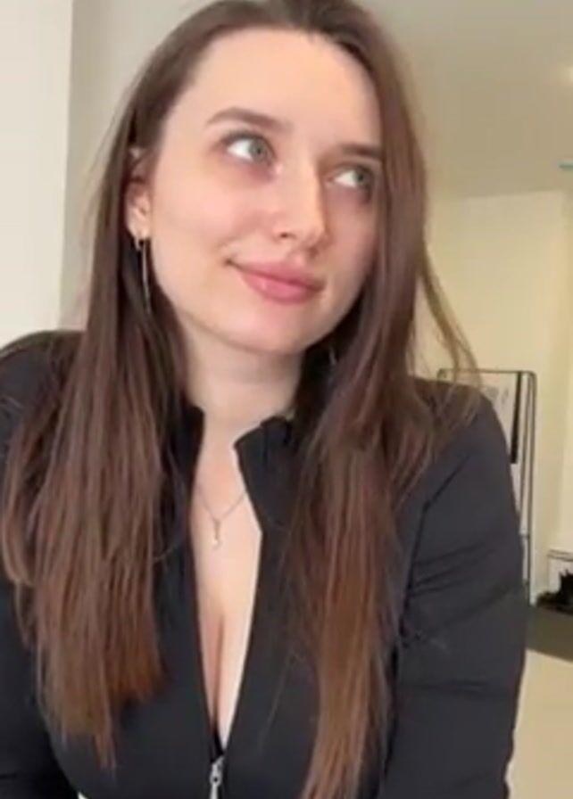 A woman with long, straight, brown hair, light skin, and green eyes looks at the camera and smiles. She is wearing a fitted black top or dress with a zipper. She has a small silver necklace and silver dangling earrings. The background appears to be inside a home with white walls. There is a doorway leading to another room visible behind her.