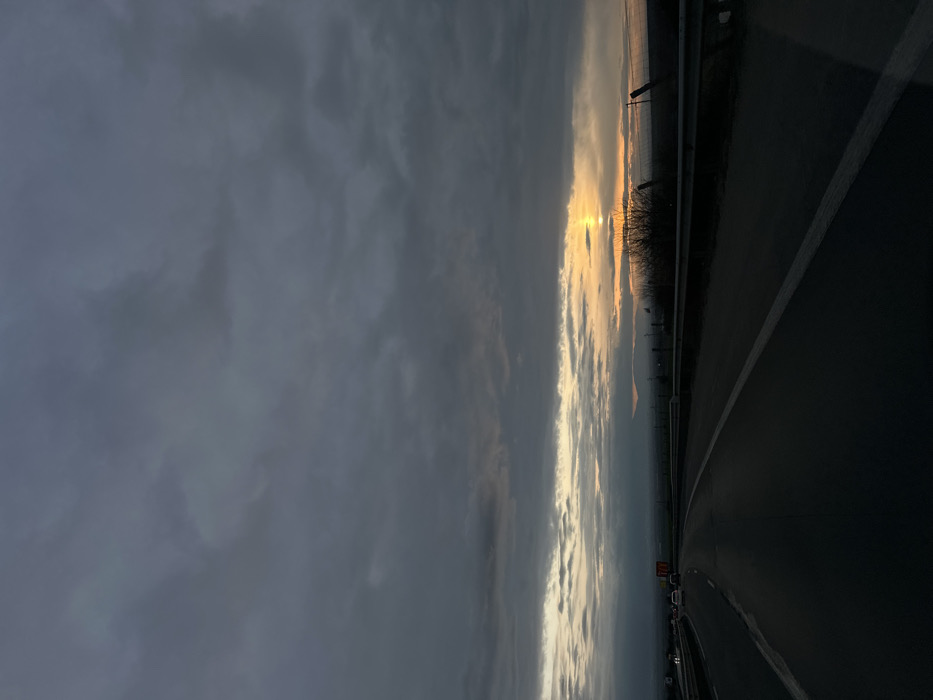 The scene depicts a multi-lane asphalt highway in the vicinity of Eleshnitsa, Bulgaria, observed at dusk. The sky is predominantly overcast with dark, grey clouds, but a prominent horizontal band of orange and yellow light is visible on the western horizon, indicating a sunset. The highway extends from the foreground into the distance, marked with white solid and dashed lines defining at least two lanes in the direction of travel. A metal guardrail parallels the right side of the road. In the distant left lane, several vehicles, identified as passenger cars, are visible as illuminated shapes. The surrounding environment consists of low-lying hills or landforms on the horizon, partially obscured by atmospheric conditions, and sparse, leafless vegetation, including a small bush, located along the right roadside beyond the guardrail. No individuals are discernible within the frame.