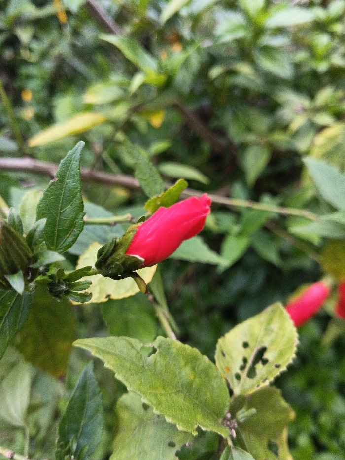 A close-up captures a vibrant red hibiscus bud amidst a lush green foliage. The bud, tightly closed, hints at an imminent bloom. Leaves in varying shades of green surround the bud, some displaying evidence of insect nibbling. A few other unopened red flower buds are seen in the blurred background. The natural light accentuates the texture of the leaves and the smooth surface of the flower bud.