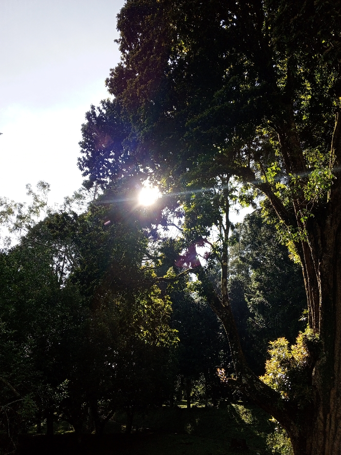 A sun-drenched forest scene where sunlight pierces through the dense canopy. Tall trees dominate the view, their branches intertwined, casting shadows on the ground below. The sun's glare creates a starburst effect as it filters through the leaves. A mix of light and dark creates a dramatic contrast.