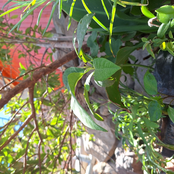 The image presents an outdoor scene of dense vegetation in Mariano Melgar, Peru, under bright, direct sunlight. In the foreground, various green plants are visible. A central plant displays prominent heart-shaped leaves, while another to its right features long, blade-like foliage. Smaller plants and dark, possibly synthetic, objects (suggesting containers or ground cover) occupy the immediate ground plane. The midground includes a slender, brown-barked tree trunk extending diagonally upwards, surrounded by irregular light-colored rocks, some casting distinct shadows. The background features a blurred red wall or structure on the right, partially obscured by additional green foliage, beneath a clear blue sky. No human subjects are present.