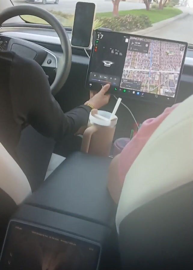 interior of a Tesla from the passenger seat perspective. A person is driving the car and another person in the passenger seat points to the central dashboard screen. The dashboard shows a map and other driving-related information. Sunglasses are hanging from the rearview mirror. A phone is mounted to the left of the dashboard screen. There is a beverage in the center console. The car is moving on a street with other cars visible in the background.