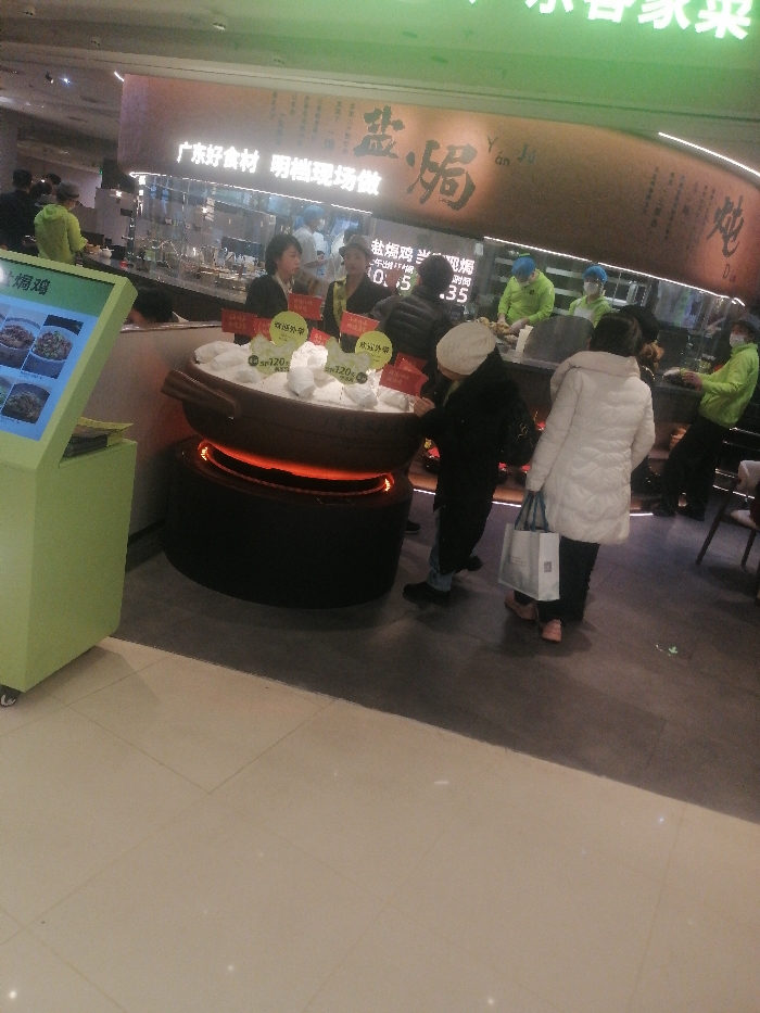 An indoor scene within a commercial food establishment, likely a food court or large restaurant specializing in salt-baked chicken, located in Dongcheng District, China. The central focus is a large, dark brown, pot-shaped display container, simulating a cooking vessel, elevated on a dark cylindrical base with an illuminated orange rim, suggesting heat. This pot is filled with numerous white, irregularly shaped food portions, identified by yellow price tags (e.g., "¥120"). Approximately eight individuals are visible. In the midground, two women, possibly staff, stand near the display; one wears a dark jacket, the other a hat and a reflective vest. Behind them, at a counter, several individuals in bright green/yellow uniforms, blue caps, and some wearing face masks are actively working, appearing to be kitchen or service staff. In the foreground, two patrons are observed; one, wearing a white puffer coat, carries a white shopping bag and walks away, while another, in a dark jacket and white beanie, observes the food display. Overhead, a large curved brown sign with illuminated Chinese characters, including "广东好食材 明档现场做" (Guangdong good ingredients, open kitchen live cooking) and "盐焗" (Salt-baked), is prominent. A digital display nearby shows "盐焗鸡" (Salt-baked Chicken) along with numerical data. To the far left, a light-green digital menu kiosk displays images of food items and Chinese text. The floor transitions from light-colored tiles in the foreground to a darker surface in the customer and service areas. The scene is brightly lit by artificial overhead lighting, with green and white light sources visible at the top of the frame.