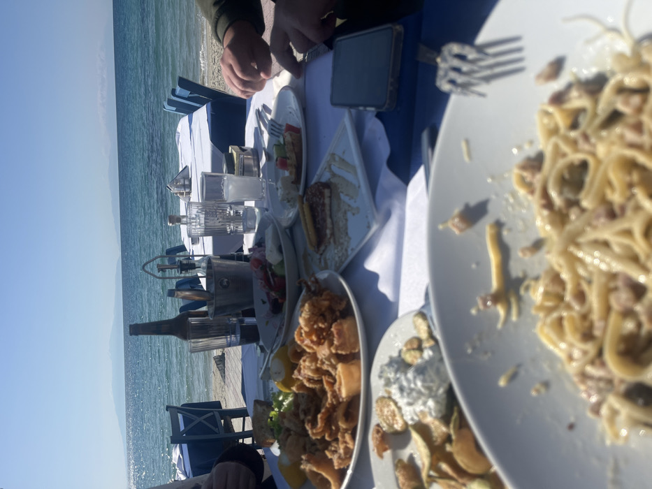 The image displays an outdoor dining scene at a coastal restaurant situated in the Kassandra Municipal Unit, Greece