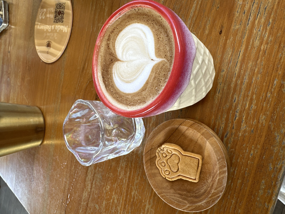The scene is set on a light brown wooden table at Made's Bakery in Ungasan, Indonesia. In the foreground, a red and white ceramic mug with a waffle-textured lower half contains a latte featuring a clear white heart in its foam. To the left of the mug, a small, circular wooden dish holds a single, light brown, paw-print shaped cookie. Behind these items, a clear glass with an irregular, somewhat organic shape and an iridescent shimmer is positioned. In the upper right background, an oval wooden coaster is visible, bearing the text "Welcome to Made's Bakery," a small coffee cup icon, and a QR code. A blurred, golden-colored cylindrical object is partially visible in the upper left background.