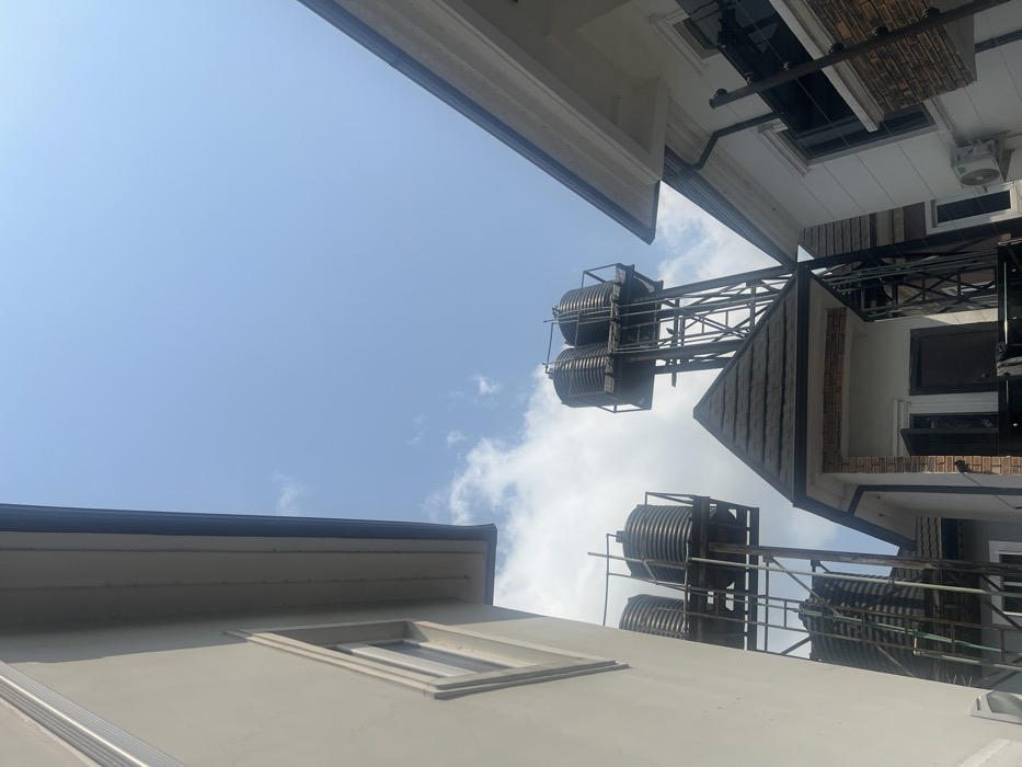 This image depicts a residential scene in Rumuofa, Nigeria, under a bright blue sky with scattered white clouds. The perspective is upward-angled, framed by building structures. On the left, a light-colored building facade with a dark-edged roofline and a visible window is present. Further into the scene on the left, two dark, corrugated cylindrical water tanks are elevated on a dark metal scaffold, with a third similar tank positioned lower on a separate, partially visible structure. Integrated ladders are present on these supports. In the center-lower portion, a smaller building structure features a dark, ridged pyramidal roof and walls with light-colored plaster and brown brick-patterned sections. A dark-framed doorway or opening is visible below a window. Adjacent to this structure, a dark metal staircase ascends. To the right, a white building facade with a dark roofline and eaves is visible. It features a dark-framed window with a small brick-patterned decorative section below it, and an external air conditioning unit mounted on the wall beneath the window. Dominating the mid-ground and right-mid-ground are two prominent, tall, dark metal lattice towers, each supporting two dark, corrugated cylindrical water tanks at their apexes. Ladders are integrated into these towers. No individuals, actions, or direct interactions are visible. The environment indicates a built-up area with prominent infrastructure for water storage.