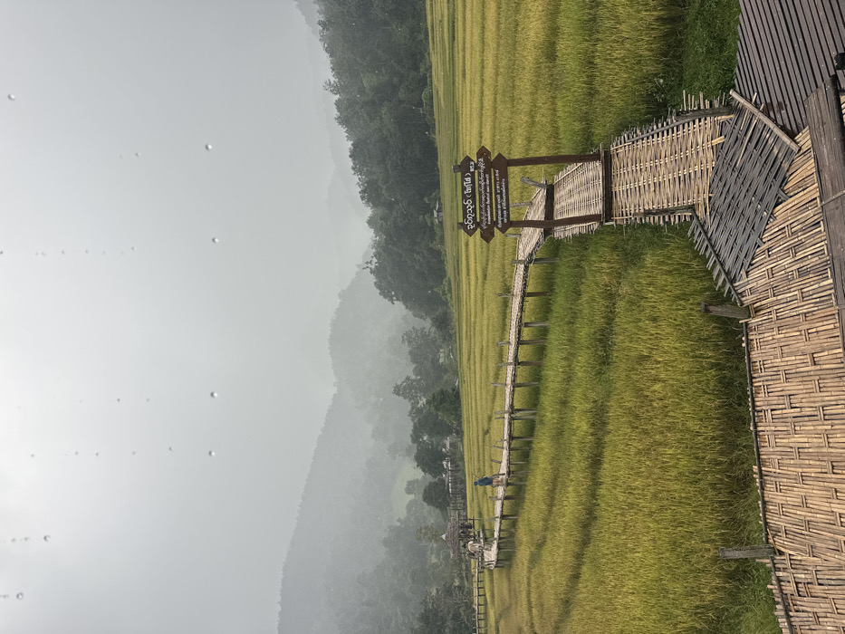 An elevated perspective showcases the Sapan Boon Kho Ku So bamboo bridge traversing golden-green rice fields in Ban Paem Bok, Thailand, under a heavily overcast sky. Water droplets adhere to an unseen transparent foreground surface, indicating rain. The multi-sectioned bamboo bridge, supported by wooden stilts, curves left into the mid-distance. A wooden signpost featuring multiple directional arrows and Thai script stands at a junction on the right side of the bridge. A lone individual, dressed in a blue garment, walks left on the bamboo walkway in the mid-ground. Further along the walkway, a small group of approximately three to four individuals gathers near distant traditional-style structures. Lush, forested mountains, partially obscured by mist or precipitation, form the distant background.