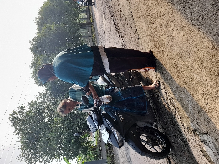 Two people stand beside a motorcycle parked on the side of a road. One individual wears a light blue hijab and a matching top with dark pants. The other person is older and wears a patterned skirt and light top. They appear to be handling something near the motorcycle's handlebars. Lush green trees and bushes are visible in the background. The road is textured with patches of darker tones, possibly indicating repairs or different materials.