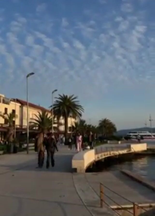 waterfront promenade. People are strolling along the promenade, passing by palm trees and buildings. The sky is blue with scattered clouds. A white boat is docked on the water. A concrete railing separates the promenade from the water's edge. Street lamps line the walkway.