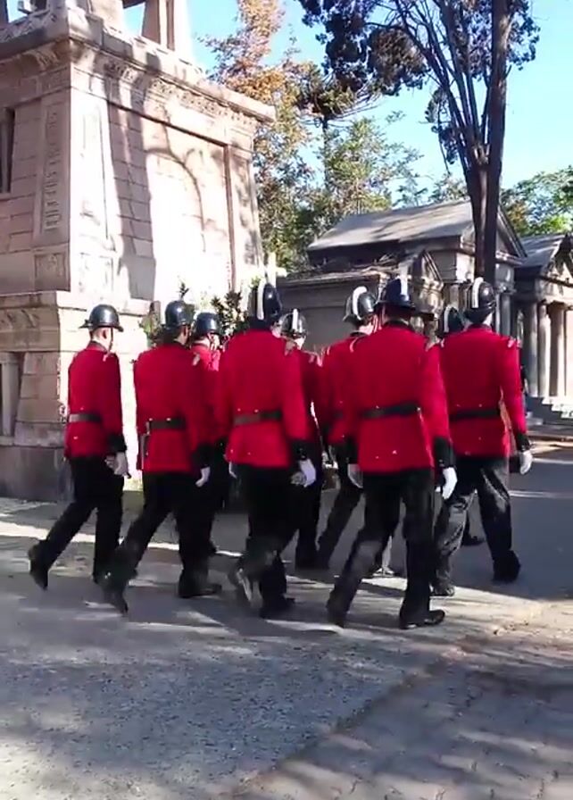 A group of eight people wearing red jackets, black pants, black shoes, and black helmets with white stripes march together on a gray paved path in a cemetery. The camera follows them from behind as they walk away from a large, ornate tomb on the left and towards other tombs and trees in the distance. The sky is blue and sunny. There are a few other people visible in the background near the distant tombs.