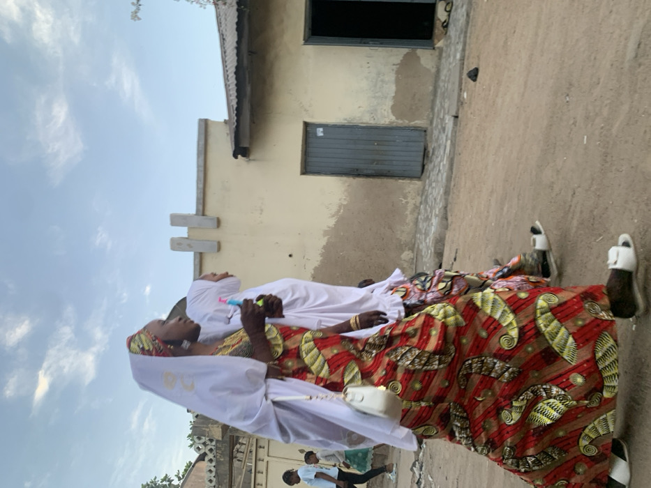 The scene depicts an unpaved street in Gwagwarwa, Nigeria, under a partially cloudy daytime sky. In the foreground, a dark-skinned woman walks leftward, wearing a vibrant red, yellow, and black patterned ankle-length dress and a white headscarf with gold embroidery draped over a multi-colored headwrap. She carries a white shoulder bag with a gold chain strap and holds a multi-colored plastic object in her right hand. Large silver hoop earrings and gold-toned bracelets adorn her. Behind her, a second dark-skinned person walks in the same direction, dressed in a white head covering and a colorful patterned garment, with white sandals visible on their feet. In the background left, several other individuals, including children, are visible. To the right, a single-story building with faded, light brown walls features a closed, grey corrugated metal door and an open, shadowed doorway. Above the building's flat roofline, two rectangular structures protrude vertically. The unpaved street surface is dry earth, with a small dark object resting on it in the mid-right. A short concrete barrier or curb runs along the base of the building. Faint green foliage is visible on the far left and right.
