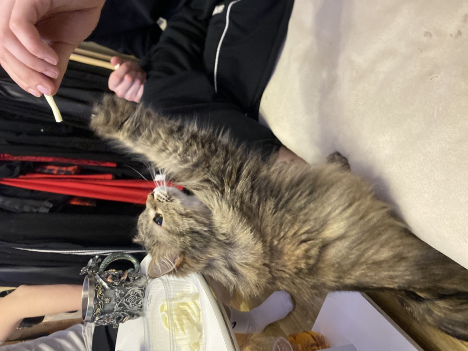 The scene is set indoors in an informal environment within Saratov, Russia. A long-haired domestic cat, exhibiting a tabby pattern in shades of brown and grey, is prominently featured, standing on its hind legs on a light-colored cushion, its front paws extended upwards. Its gaze is directed towards a small, light-colored, elongated food item held between the thumb and index finger of a fair-skinned human hand. This human, partially visible, wears dark athletic trousers with a white stripe. To the left, a white table holds a clear plastic container containing several curled, pale yellow food items, and a distinctive metallic mug adorned with dragon or gargoyle-like relief. A person's lower leg in a white sock is visible beneath the table, and another individual in a light shirt is partially seen at the table's edge. A clear plastic cup with an amber liquid rests on a surface near the floor. The background consists of a clothing rack displaying dark garments, with a bright red fabric piece notably positioned on the right. The image captures the cat's active attempt to acquire the offered food from the human hand.