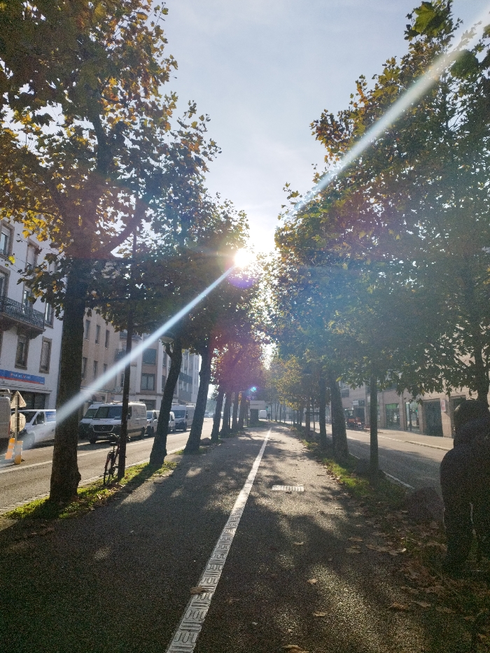 The image displays a sunlit street scene identified as Avenue de la Marseillaise in Strasbourg, France. The perspective is looking eastward down a long, tree-lined thoroughfare. The scene features numerous mature deciduous trees, exhibiting green and yellowish-brown foliage, lining both sides of the avenue. Strong direct sunlight from the upper center-right creates prominent lens flare and casts long, distinct shadows across the ground, indicating either morning or late afternoon. On the left, a paved vehicle road is visible, hosting several parked white commercial vans. Orange traffic cones are positioned near the front-most van. A dark-colored bicycle is parked upright against a tree trunk. Beyond these, multi-story urban buildings with windows and balconies are present, one featuring a "Banque Populaire" sign. The foreground and middle ground are dominated by a dark asphalt pathway, likely a shared-use path or bike lane. This path is marked by a continuous white line and a tactile paving strip with an undulating pattern along its left edge. Scattered fallen leaves are visible on the path's surface. On the far right, a human figure wearing a dark top is partially visible in the lower corner, silhouetted and facing away from the camera, appearing stationary. Further right, beyond more trees, another paved vehicle road runs parallel, bordered by multi-story buildings with commercial establishments. The sky above is mostly clear with a bright haze around the sun.