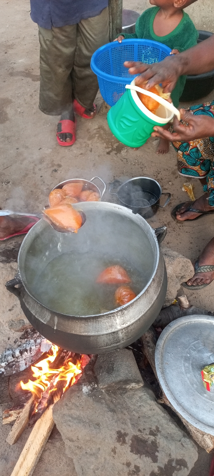 People are cooking outdoors over an open fire. A large metal pot sits on the fire, filled with water and orange-colored food, likely yams or sweet potatoes. Some of the food items are being transferred from a green and white plastic container into a blue basket. Nearby, another pot holds cooked food. The cooking setup is basic, with the fire built on the ground and supported by stones.